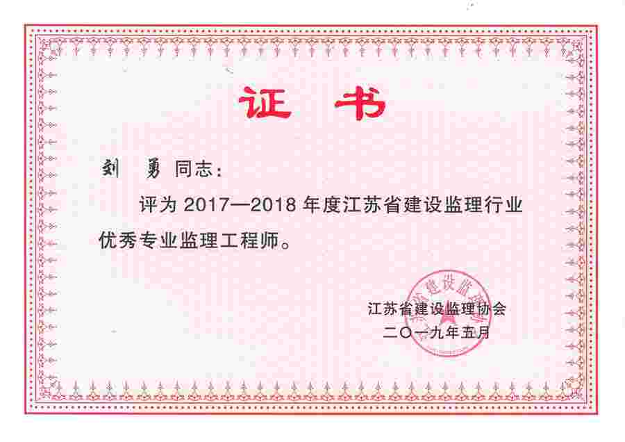 刘勇2017-2018年度省优秀专业监理工程师